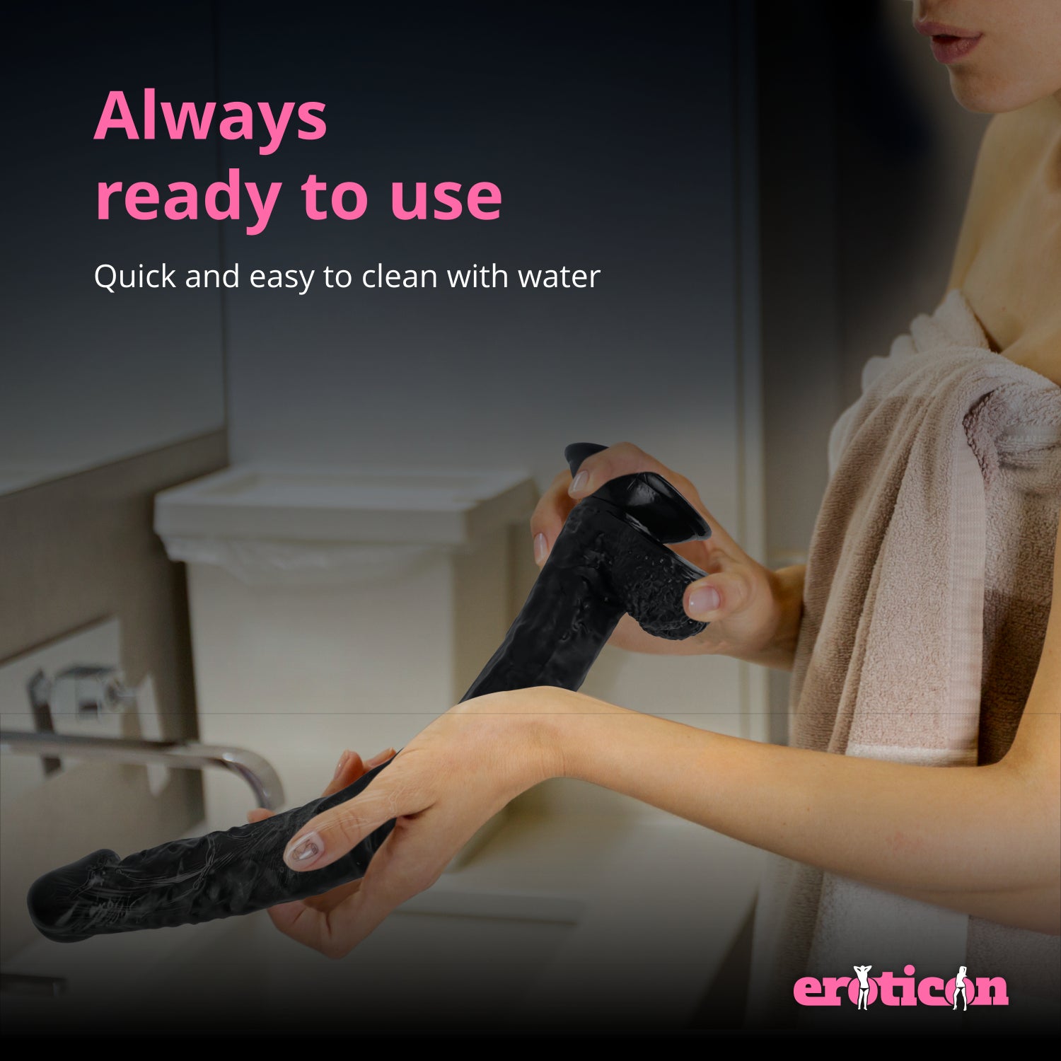 Also use with our Eroticon sex machines if you have a 3xlr to suction cup reducer. Looking for an exciting new challenge? Then the Black mega dildo from Eroticon is just what you need! This large, thick and extreme dildo is perfect for lovers of XXL toys. Measuring 40 x 4cm and weighing 700 grams, this giant dildo is ideal for an intense experience. Try this XL dildo today and experience ultimate pleasure! Ultra-large dildo of 40 x 4cm size Weighs only 700 grams Made of high-quality black silicone material Realistic shape and texture for an intense experience Perfect for solo use or with your partner Easy to clean with warm water and soap, or with Eroticon toy cleaner Add some lubricant for a smoother experience, preferably Eroticon lubricant Large dildo for ultimate pleasure: The Mega dildo black by Eroticon is a giant dildo measuring 40 x 4 cm and is almost as big as an average forearm! Because of this, the size is quite similar to a Horse Dildo. Discover new adventures, anal and vaginal: With this extreme dildo, you will live only extreme experiences. This monster dildo is suitable for lovers who like things a little bigger. Frequently Asked Questions Is the Mega dildo black by Eroticon suitable for beginners? Yes, this dildo is suitable for both beginners and experienced users. Just keep in mind that for many beginners, the dildo can be a bit large. Is the Mega dildo easy to clean? Yes, the Mega dildo black by Eroticon is easy to clean with warm water and mild soap. Be sure to dry the dildo thoroughly after cleaning. You can also optionally use Eroticon toy cleaner for even better cleaning of the product. Does the Mega dildo weigh a lot? No, despite its large size, the Mega dildo black from Eroticon weighs only 700 grams. This makes it easy to handle and comfortable to use. Can I have the Mega dildo shipped discreetly? Yes, the Mega dildo black from Eroticon is discreetly packaged and shipped by , so your privacy is guaranteed. Can I attach the product to something? Yes, the product can be fixed on a smooth surface using the suction cup backing.