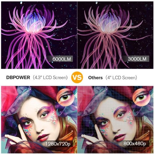 - [REMARKABLE BRIGHTNESS AND CLARITY]: DBPOWER L21 adopts the latest 4.3’’ LCD display technology with advanced LED light sources, bright 200ANSI-6000Lux, 3000:1 contrast ratio, supporting 1920x1080p highest resolution makes it brighter than other comparable Mini projectors on the market.