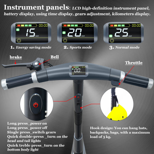 6. Smart LCD Display & Multi-Function Switch. The new LCD display can adjust the speed, speed gear, battery power, lighting and usage time. The multi-function buttons can adjust the lights (headlights/taillights/bottom lights) and speed gear adjustment